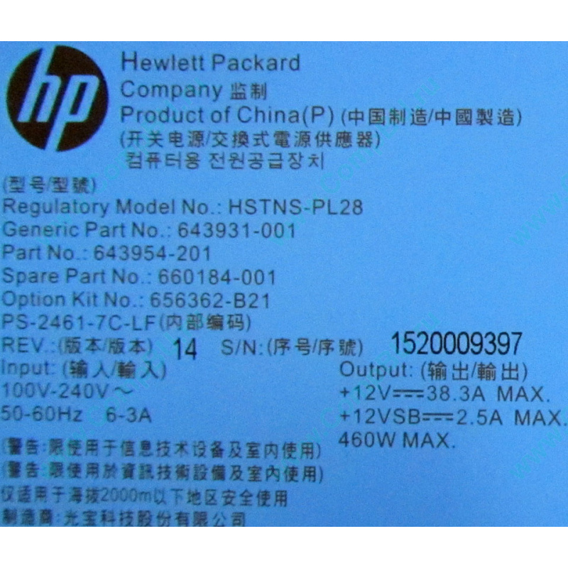 Блок питания HP 643954-201 660184-001 656362-B21 HSTNS-PL28 PS-2461-7C-LF 460W для HP Proliant G8 (Домодедово) Изображение большего размера
